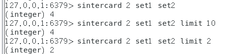 sintercard 2 set1 set2 limit 10 : 返回 set1 和 set2 这 2 个集合交集的元素个数,最大值为10