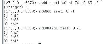 zadd zset1 60 n1 70 n2 65 n3 : 给zset1中添加元素及其分数,n1分数60,n2分数70,n3分数65