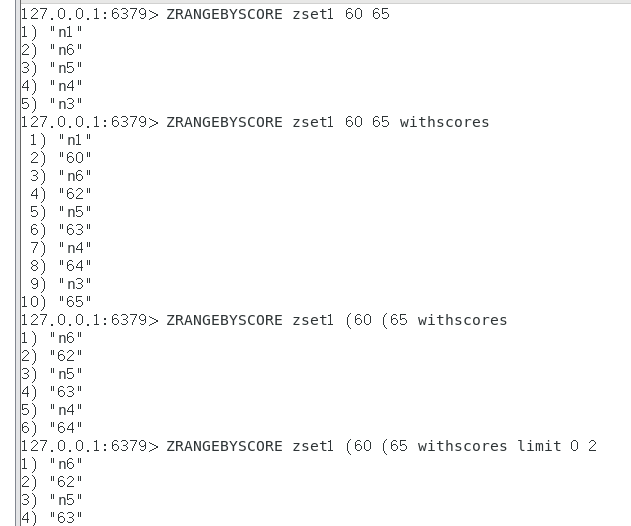 zrangebyscore zset1 (60 (65 withscores: (60 (65指不包含60和65