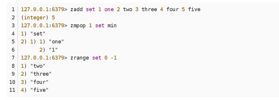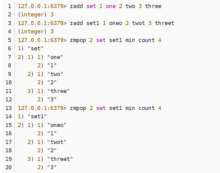 zmpop 2 set set1 min count 4 : 弹出 set (第一个非空排序集) 中最小的4个值