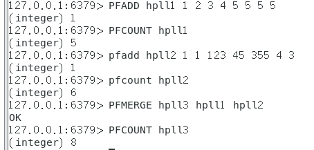 pfadd hpll1 1 2 3 4 5 6 : 向hpll1输入元素1 2 3 4 5 5 5,但元素不会进行存储,只会去重统计基数