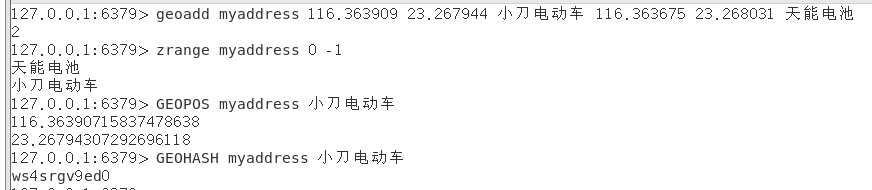geoadd myaddress 116.363909 23.267944 小刀电动车 116.363675 23.268031 天能电池:向myaddress中插入两个地址,类似于zset,不过原来的score换成了坐标