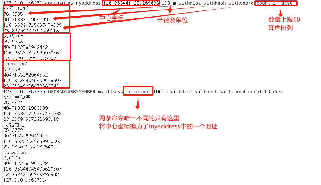 georadiusbymember myaddresss location1 100 m withdist withhash withcoord count 10 desc:与上一条命令相同,但是中心坐标是使用myaddress中的location1