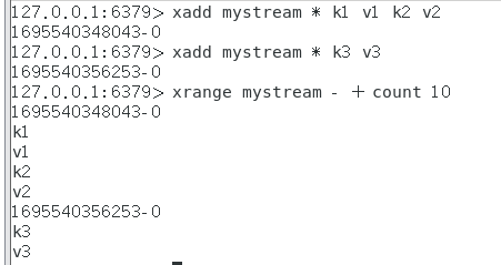 xadd mystream * k1 v1 k2 v2 : 向mystream中插入两条消息k1和k2,值为v1和v2。id的位置上的 * 代表自动生成id。插入后返回id,id由2部分组成,“毫秒时间戳-当前消息在同毫秒内的消息序号”