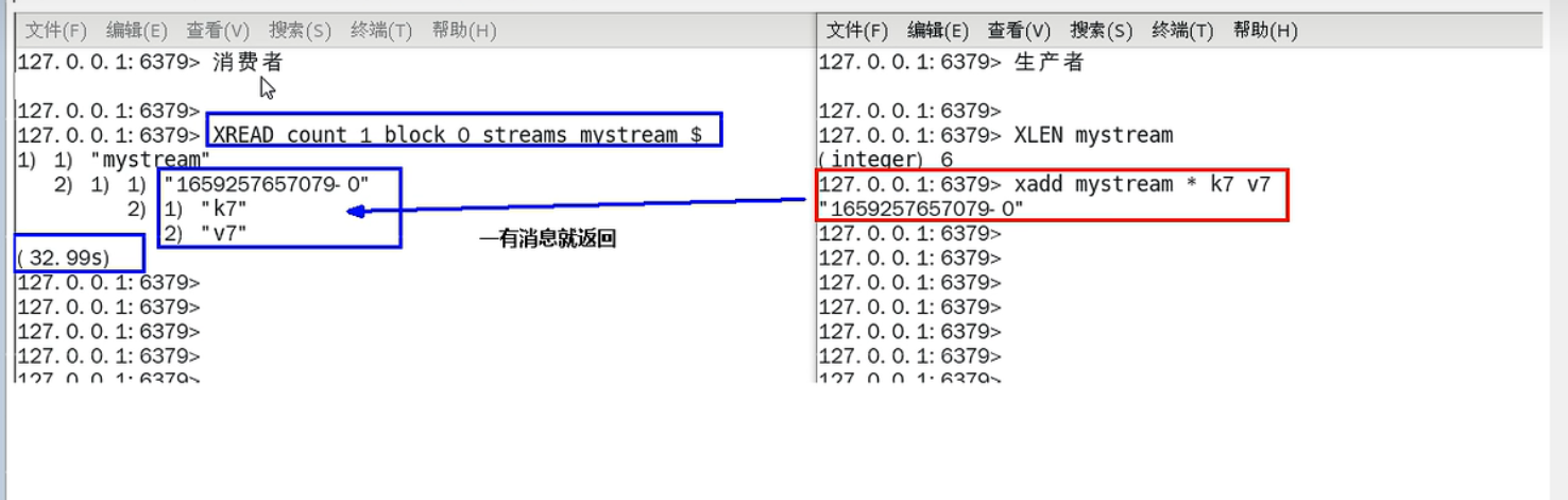 xread count1 block 0 streams mystream $ : 永远阻塞,直到在mystream中读取到比目前最大id还大的1条消息为止