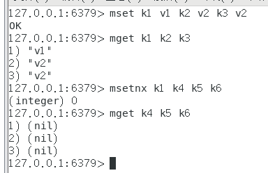 键不存在的情况下设置多个键,需要注意的是msetnx中只要有一个是已存在的,那么所有对键的设置都不会执行,比如这里k1已经存在,则k4 k5 k6都不会被设置