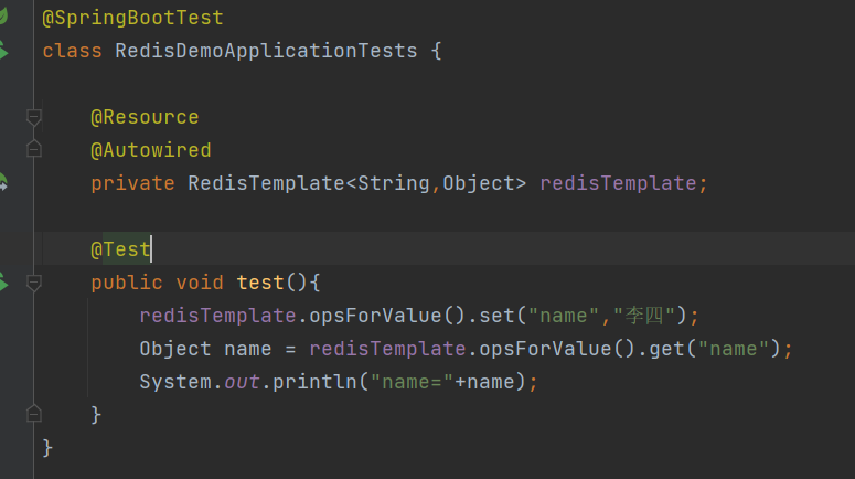 | @SpringBootTest class RedisTemplateApplicationTests { @Resource @Autowired private RedisTemplate redisTemplate;