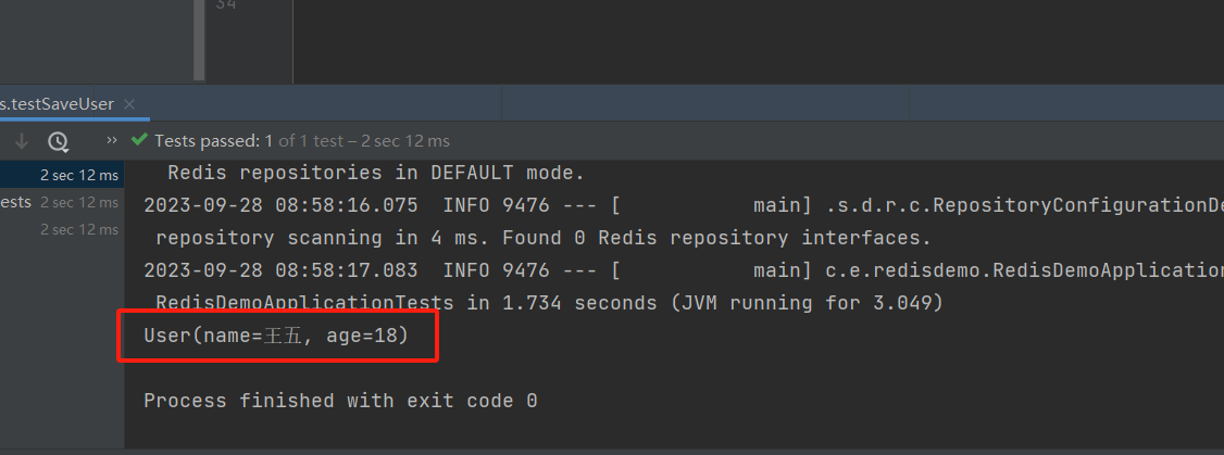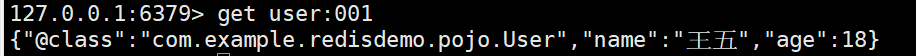| @Test public void testSaveUser(){ redisTemplate.opsForValue().set("user:001",new User("王五",18)); User o = (User) redisTemplate.opsForValue().get("user:001"); System.out.println(o); }