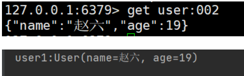 | @Test public void testSaveUser2() throws JsonProcessingException { User user = new User("赵六",19); String json = mapper.writeValueAsString(user); stringRedisTemplate.opsForValue().set("user:002",json); String val = stringRedisTemplate.opsForValue().get("user:002"); User user1 = mapper.readValue(val, User.class); System.out.println("user1:"+user1); }