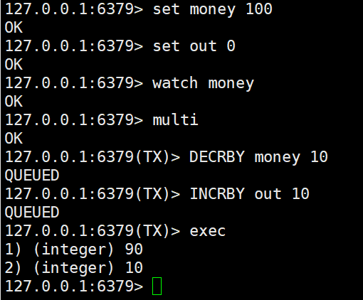 使用watch命令监视money. 在事务的执行过程中,money的值没有被其他用户修改,则事务可以正常执行