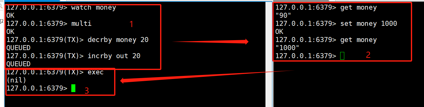 当我们使用watch监视money时,开启事务而未执行事务期间,如果另一个用户修改了money的值,那么这个事务中的所有命令都不会被执行。