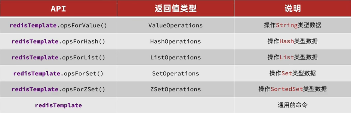 SpringDataRedis中提供了RedisTemplate工具类,其中封装了各种对Redis的操作。并且将不同数据类型的操作API封装到了不同的类型中: