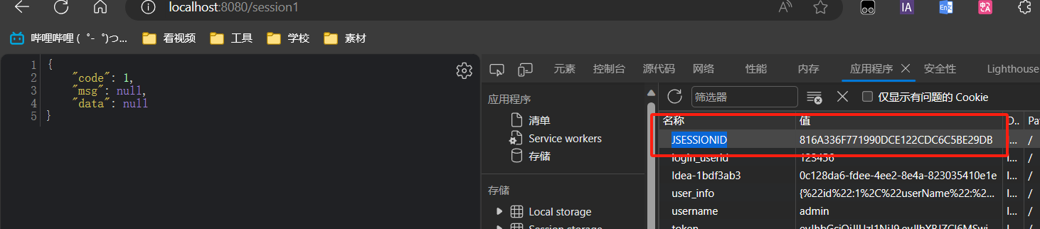 当访问session1时可以看到存在一个名为JSESSIONID的Cookie,这个就是此次会话的id