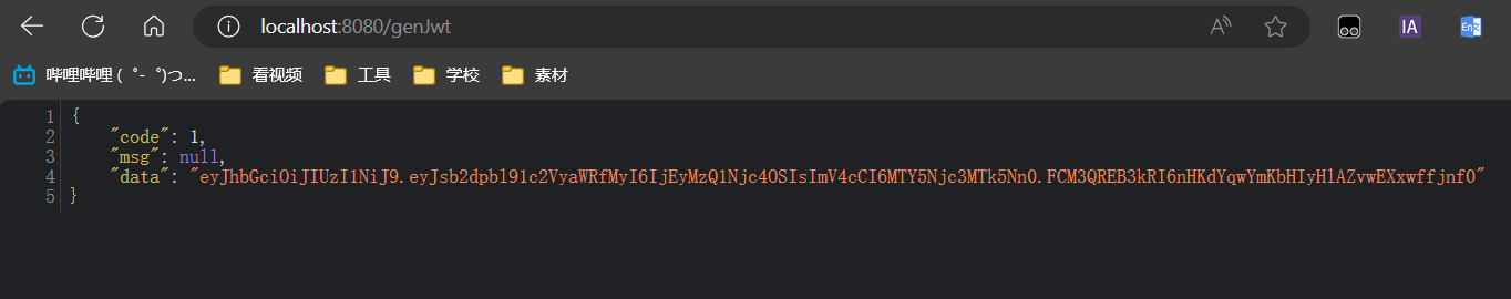 3.2 生成JWT 1 2 3 4 5 6 7 8 9 10 11 12 13 14 15 16 17 18 @GetMapping("/genJwt") public Result genJwt () { Map<String, Object> claims =new HashMap <>(); claims.put("login_userid_3" ,"123456789" ); String jwt = Jwts.builder() .setClaims(claims) .signWith(SignatureAlgorithm.HS256, "This_is_a_key" ) .setExpiration(new Date (System.currentTimeMillis() + 30 * 60 * 1000 )) .compact(); return Result.success(jwt); }