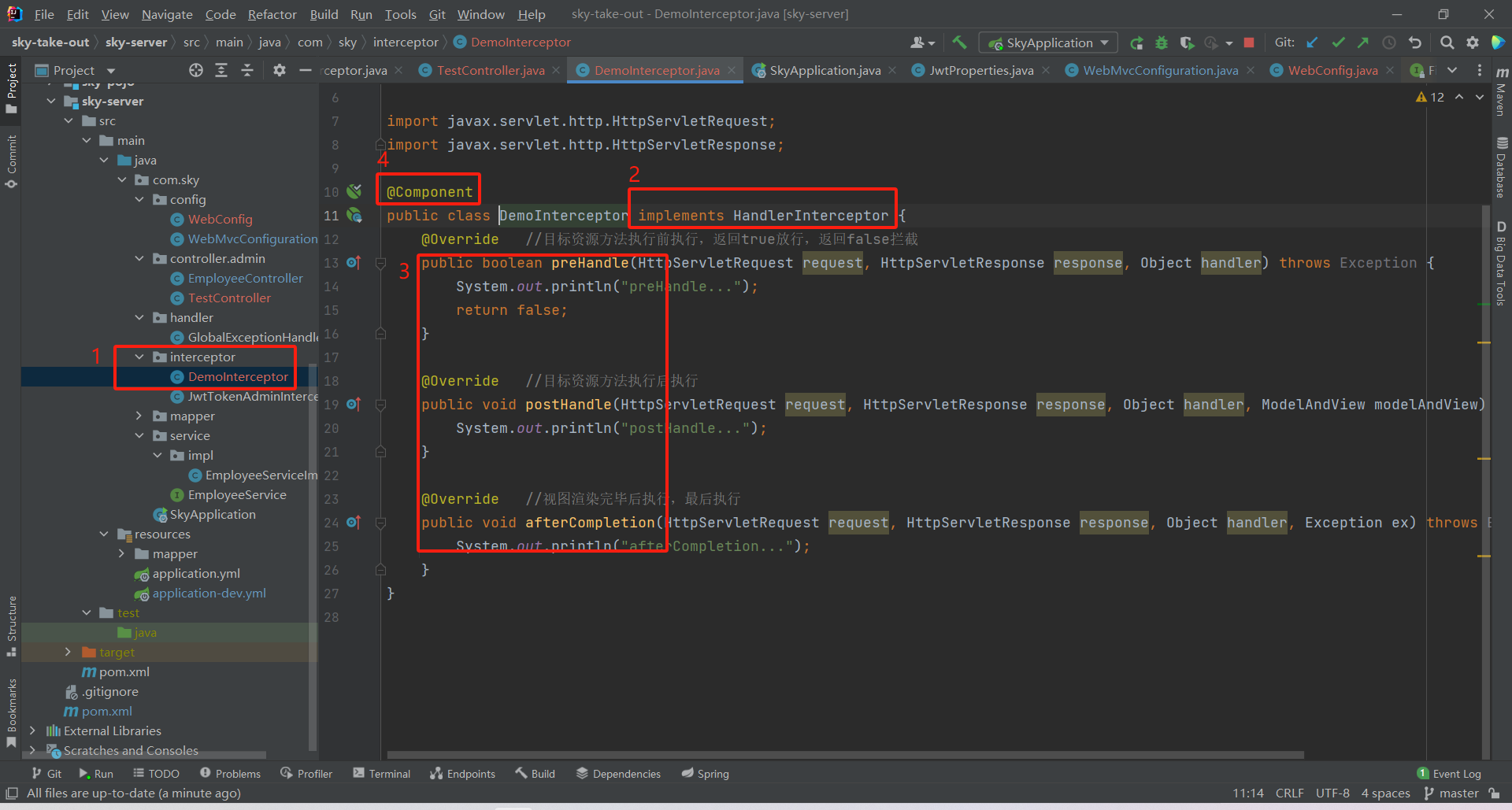 实现HandlerInterceptor接口 ,然后ctrl+o可以调出重写方法的窗口,重写preHandle()、postHandle()、afterCompletion(),最后在这个类上 加上@Component注解 ,交给IOC容器管理