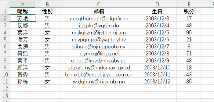 | @Data @AllArgsConstructor @NoArgsConstructor public class UserInfoModel { @ExcelProperty(value = "昵称",index = 0) private String name; @ExcelProperty("性别") private String gender; @ExcelProperty("邮箱") private String email; @ExcelProperty("生日") @DateTimeFormat(value = "yyyy-MM-dd") private Date birthday; @ExcelProperty("积分") private Integer score; }