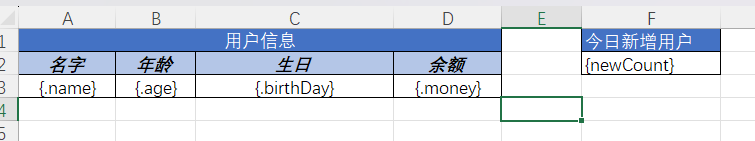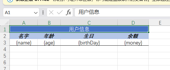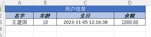 @Test public void test2(){ File template = new File("src/main/resources/template.xlsx"); Map<String,Object> map = new HashMap<>(); map.put("name","王建国"); map.put("age",18); map.put("birthDay",new Date()); map.put("money",BigDecimal.valueOf(1888.88)); EasyExcel.write(PATH) .withTemplate(template) .sheet() .doFill(map);