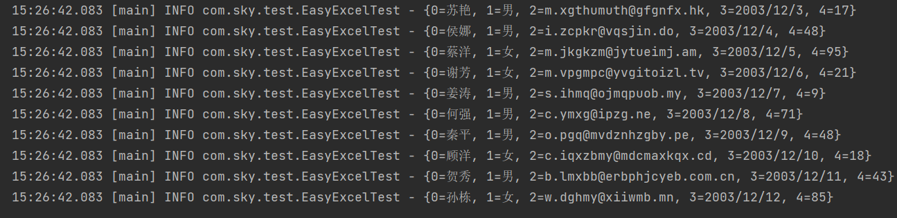 | @Test public void test3(){ File file = new File("src/main/resources/template/test.xlsx"); List<Map<Integer,String>> sheet = EasyExcel.read(file).sheet(0).doReadSync(); for (Map row : sheet) { log.info("昵称:{}\t性别:{}\t邮箱:{}\t生日:{}\t积分:{}", row.get(0),row.get(1),row.get(2),row.get(3),row.get(4)); } }