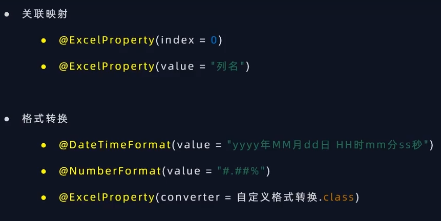 | @Data @AllArgsConstructor @NoArgsConstructor @Builder public class User { @ExcelProperty("名字") private String name; @ExcelProperty("年龄") private Integer age; @ExcelProperty("生日") @DateTimeFormat("yyyy年MM月dd日") private Date birthDay; }