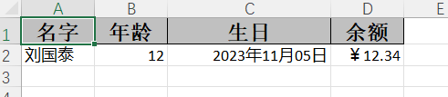| @Slf4j public class ExcelTest { private final String PATH ="src/main/resources/test.xlsx"; @Test public void test1(){ User user1 = User.builder() .name("刘国泰") .age(12) .birthDay(new Date()) .money(BigDecimal.valueOf(12.34)) .build();