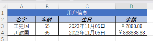 User user1 = User.builder() .name("王建国") .age(55) .birthDay(new Date()) .money(BigDecimal.valueOf(2888.88)) .build(); User user2 = User.builder() .name("川建国") .age(65) .birthDay(new Date()) .money(BigDecimal.valueOf(888881.88)) .build(); List list = Arrays.asList(user1,user2); writer.fill(list,sheet); }