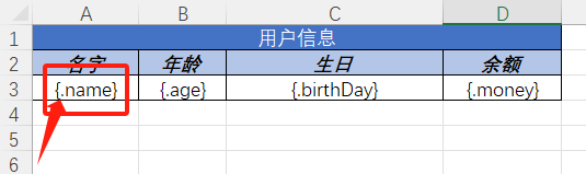 @Test public void test3(){ File template = new File("src/main/resources/template.xlsx"); User user = User.builder() .name("王建国") .age(55) .birthDay(new Date()) .money(BigDecimal.valueOf(2888.88)) .build(); EasyExcel.write(PATH) .withTemplate(template) .sheet() .doFill(user);