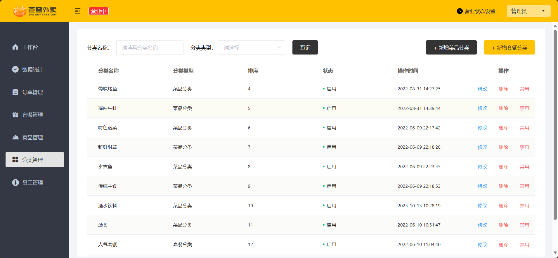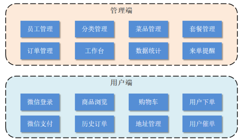 | 分类管理 | 主要对当前餐厅经营的 菜品分类 或 套餐分类 进行管理维护, 包含查询、新增、修改、删除等功能 |