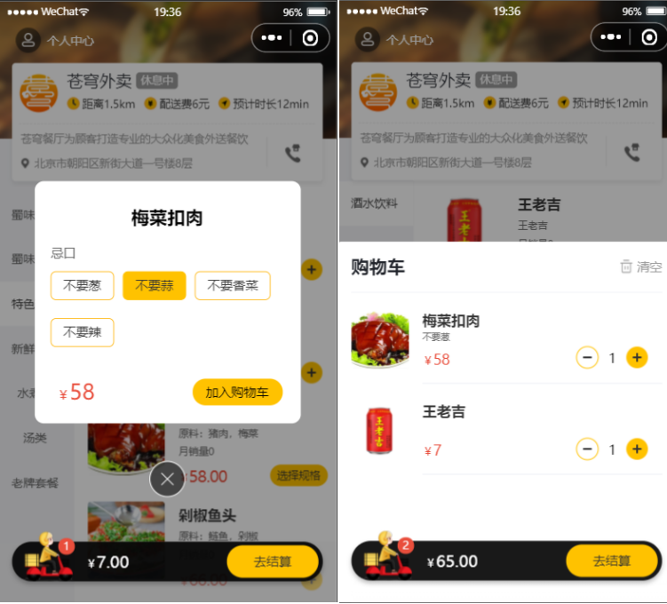 | 购物车 | 将选中的商品加入购物车列表,支持加入不同规格的同种菜品及价格合计预览 |