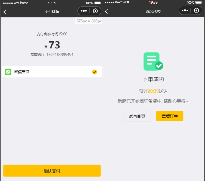 | 微信支付 | 用户下单后点击支付,调用微信接口服务,完成微信支付 |