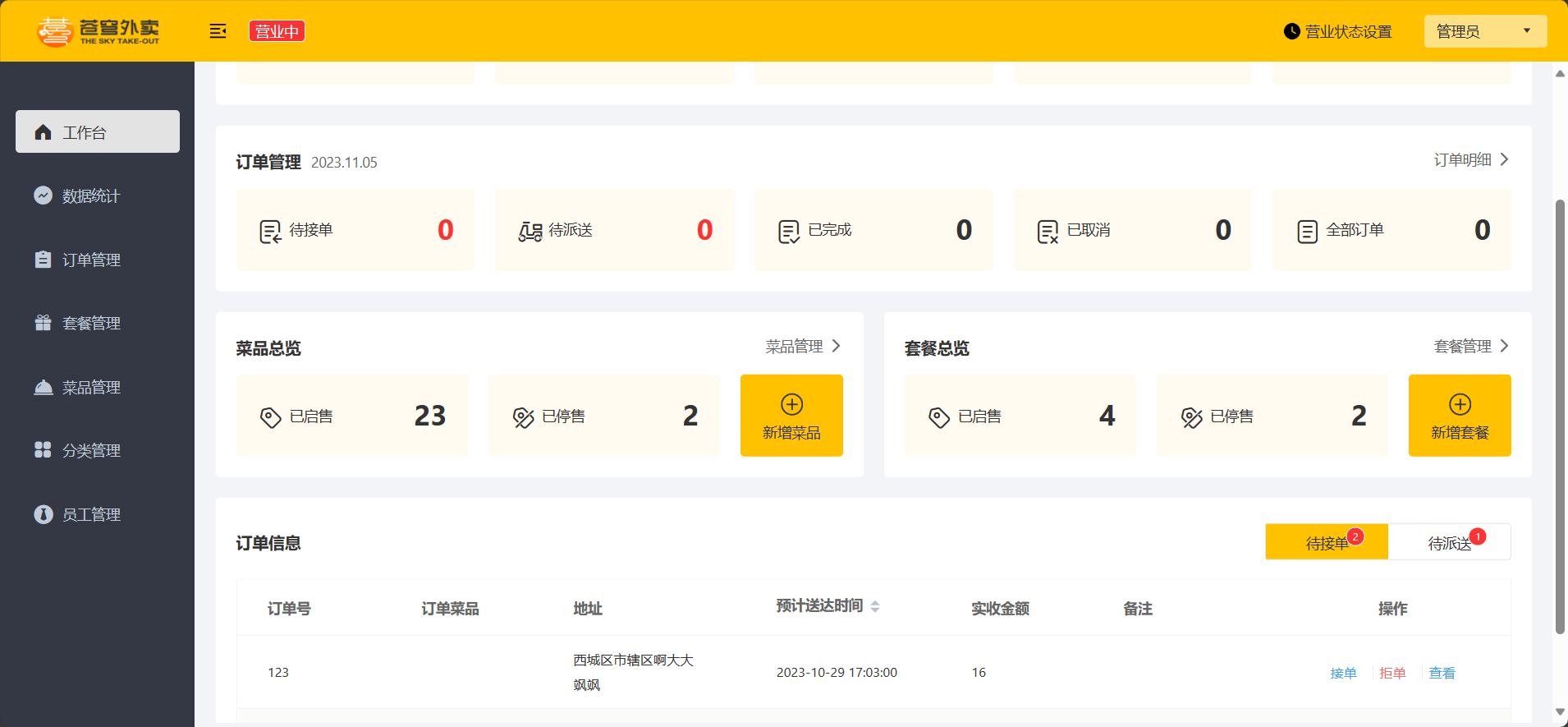 | 工作台 | 展示今日营业数据、订单总览、菜品和套餐总览、及待完成订单信息,操作待完成订单 |
