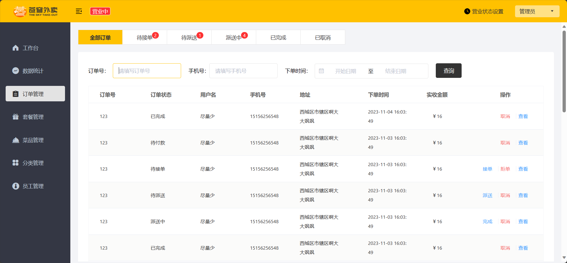 | 订单管理 | 主要维护用户在用户端下的订单信息,包含查询、取消、派送、完成 |
