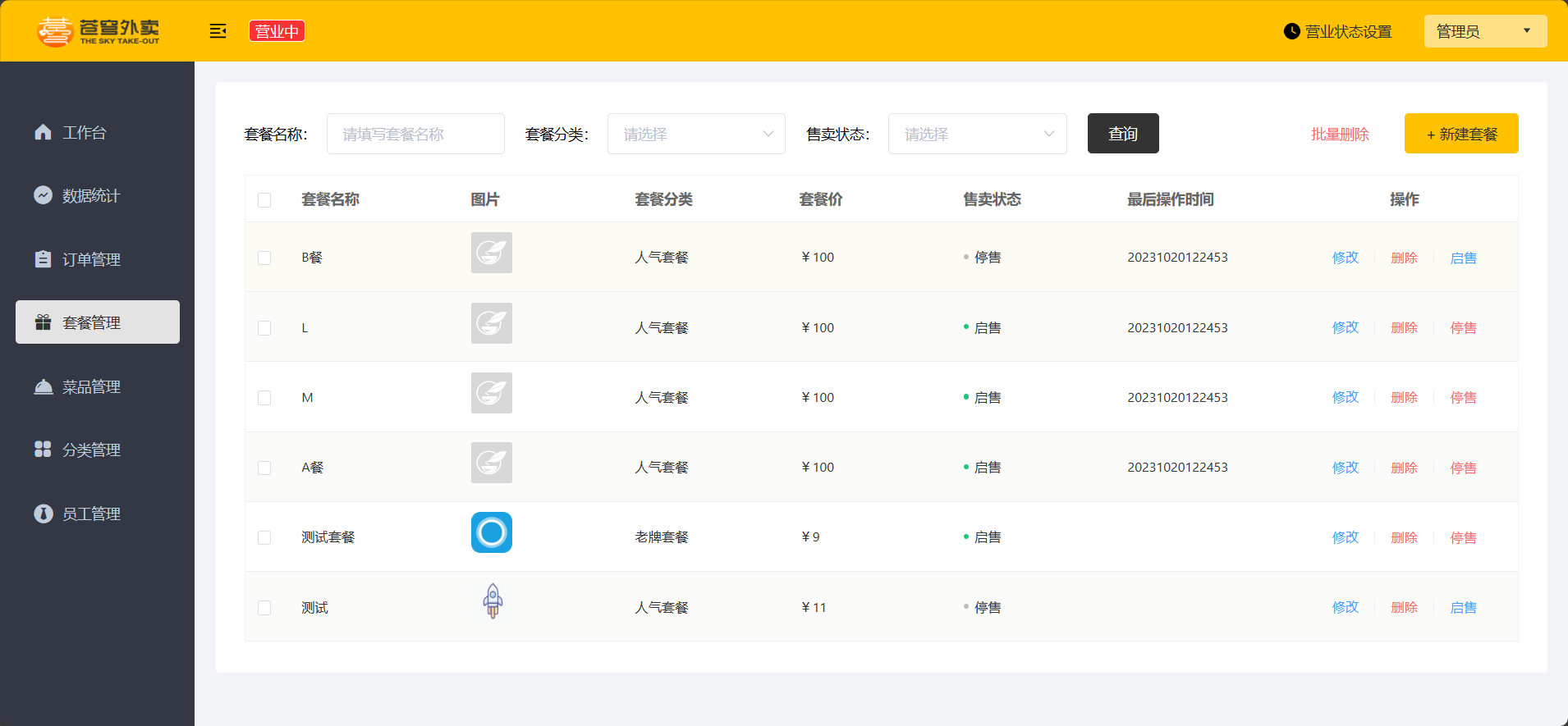 | 套餐管理 | 主要维护当前餐厅中的套餐信息,包含查询、新增、修改、删除、启售、停售等功能 |