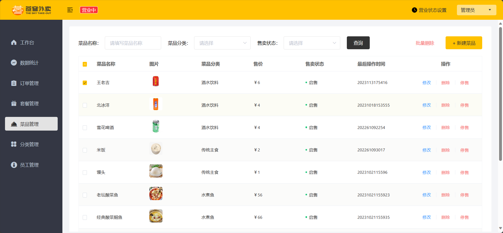 | 菜品管理 | 主要维护各个分类下的菜品信息,包含查询、新增、修改、删除、启售、停售等功能 |