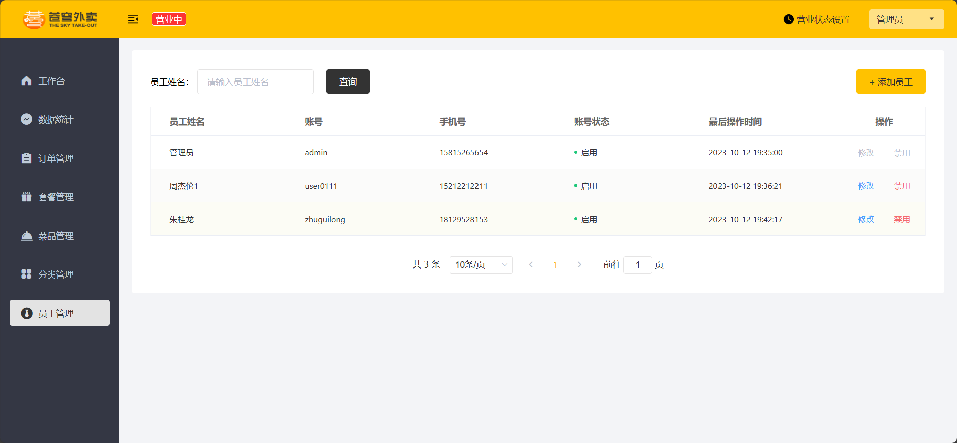 | 员工管理 | 管理员可以在系统后台对员工信息进行管理,包含查询、新增、编辑、禁用等功能 |