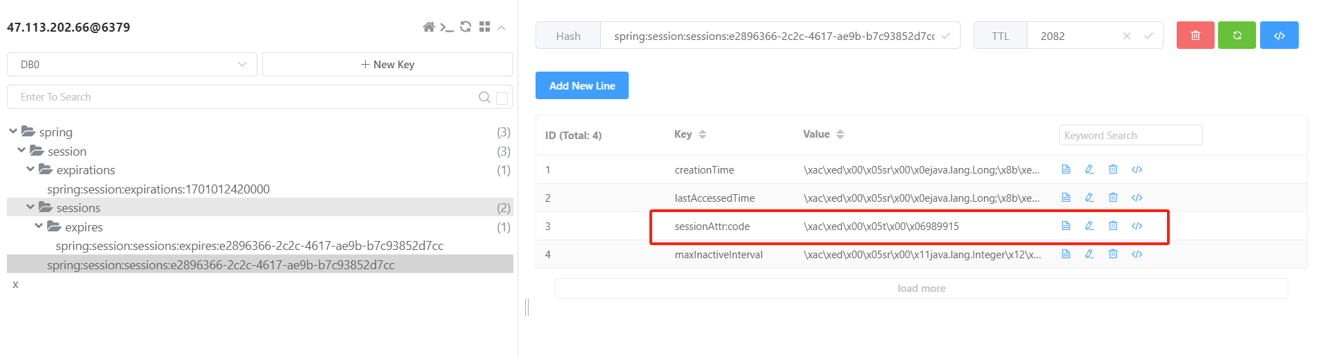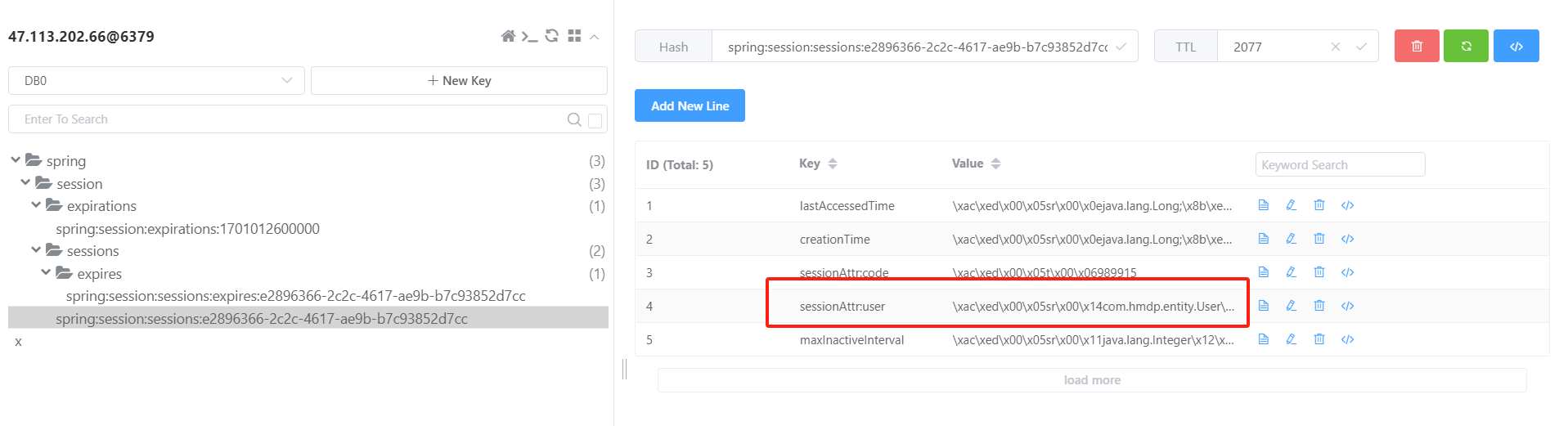 当发送验证码后,来到Redis可以看到,Session以及自动被保存到Redis中了,并且其携带的验证码及其他参数也在其中。