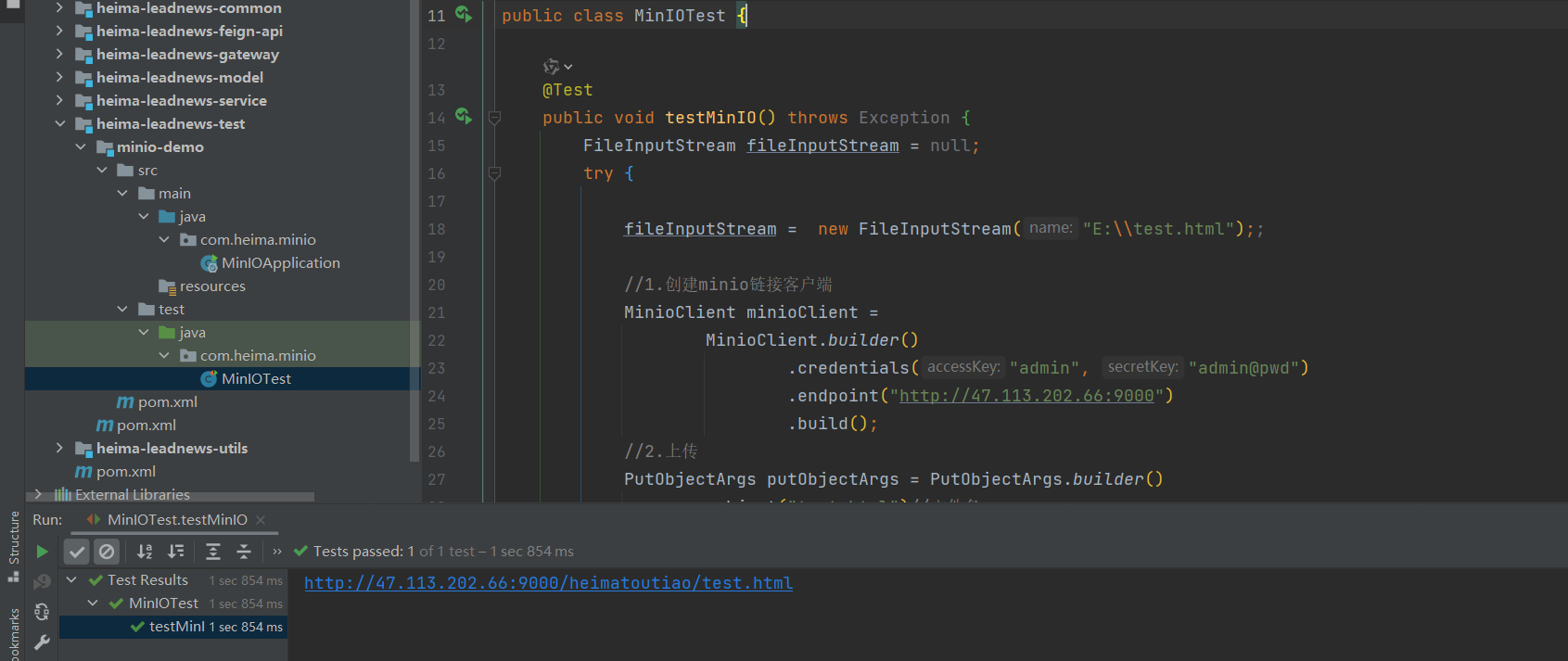 @Test public void testMinIO() throws Exception { FileInputStream fileInputStream = new FileInputStream("E:\\test.html"); String path = fileStorageService.uploadHtmlFile("", "test.html", fileInputStream); System.out.println(path); } }